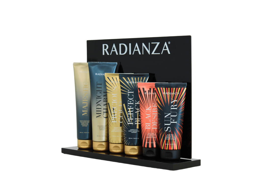 Mettez en évidence vos bouteilles de cosmétiques RADIANZA actuelles avec ce présentoir qui attire l'attention.